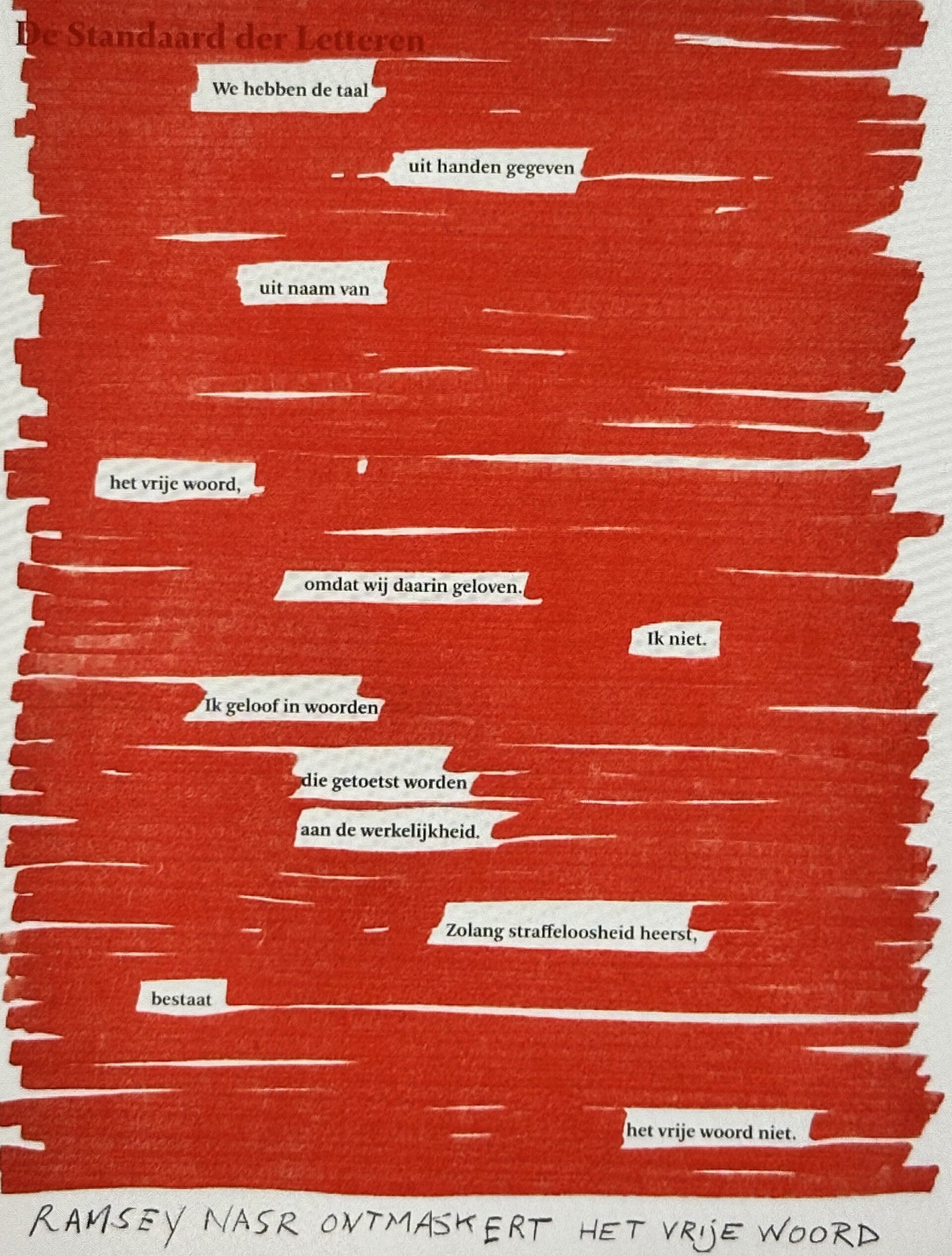 'We hebben de taal uit handen gegeven uit naam van het vrije woord, omdat wij daarin geloven. Ik niet. Ik geloof in woorden die getoetst worden aan de werkelijkheid, die begrensd zijn en niet van alle inherente betekenis ontdaan kunnen worden. Zolang straffeloosheid heerst (wat een synoniem is voor de vrije daad), bestaat het vrije woord niet. Althans, niet wat wij zo slordig daaronder verstaan.